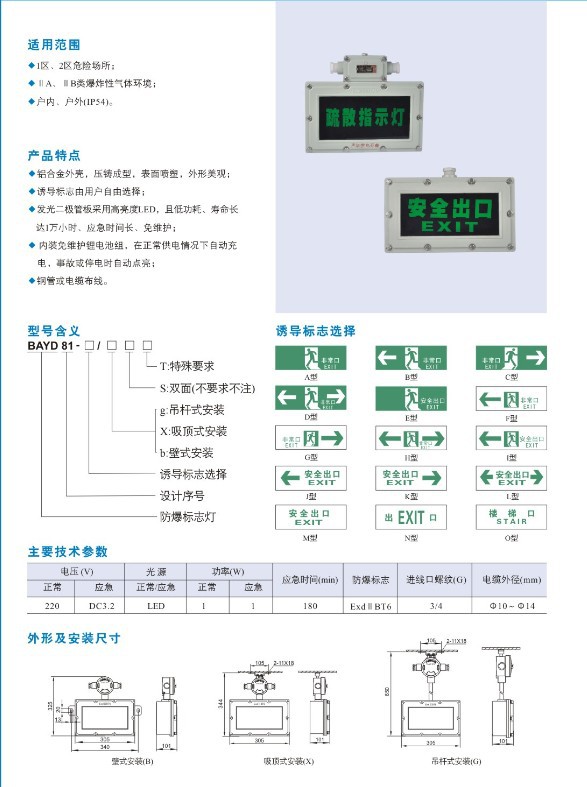 適用(yong)于(yu)易燃易爆場所工(gong)作,用(yong)于(yu)各種室內、外工(gong)作場所。中國(guo)煤炭行業(ye)、中石油、中石化(hua)、中海油、電力、冶金、鋼(gang)鐵、船(chuan)舶、部隊、航(hang)空(kong)航(hang)天、公安消防、化(hua)工(gong)、部門及(ji)大型企業(ye)照明的使用(yong)和需要。