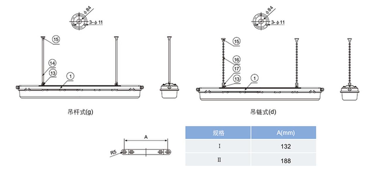● 吊桿式安裝常規供貨為側進線,若需上進線訂貨時請注明;