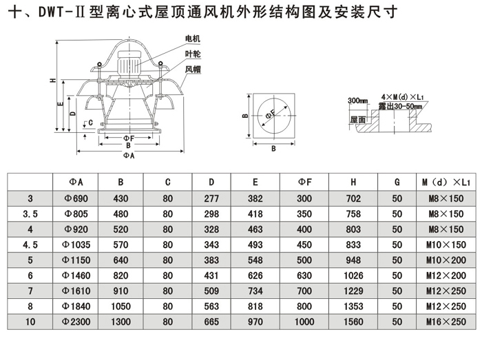 1.軸流式屋頂風機直徑自300-2400mm,供十七種機號,離心式屋頂風機有300-1000mm九種機號。還可根據用戶需要提供其它機號的風機;