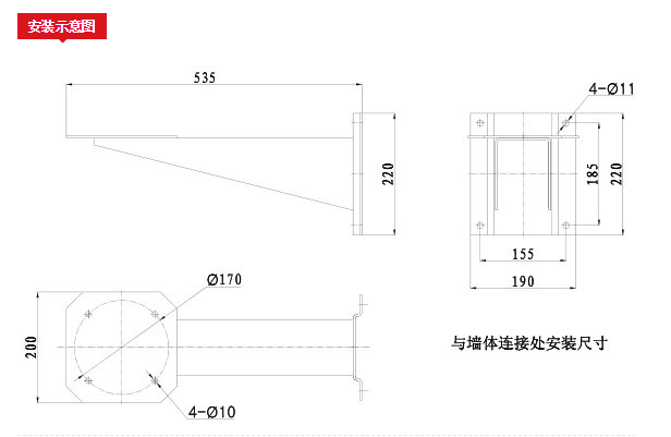該云臺支架為防爆電動云臺系列產品標準配套支架,防爆電動云臺的安裝方式為壁裝或立桿。安裝尺寸詳見產品技術參數。