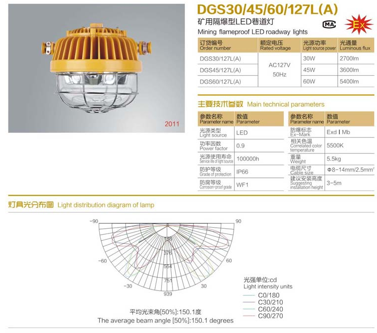 首頁>防爆燈具>防爆固定照明燈>防爆LED燈 > DGS30/45/60/127L(A)礦用隔爆型LED巷道燈