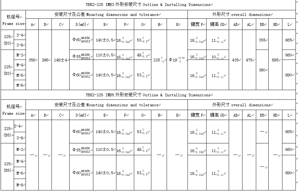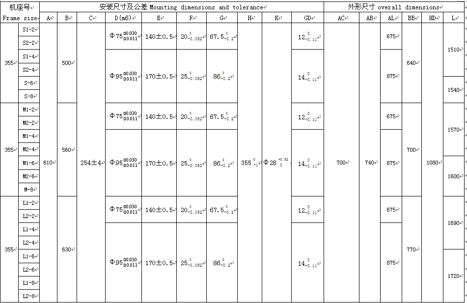電動機的功率、轉速及機座號的對應關系見表1(6000V)、表2(10000V),技術數據見表3(6000V)、表4(10000V);