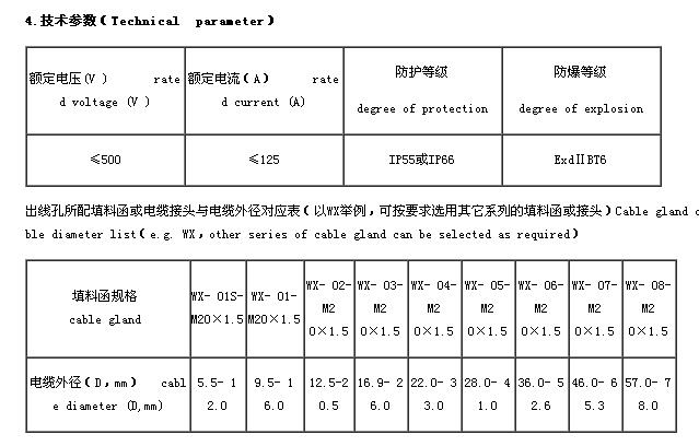 出線孔所配填料函或電纜接頭與電纜外徑對應表(以WX舉例,可按要求選用其它系列的填料函或接頭)Cable gland of outlet diameter and cable diameter list(e.g. WX,other series of cable gland can be selected as required)