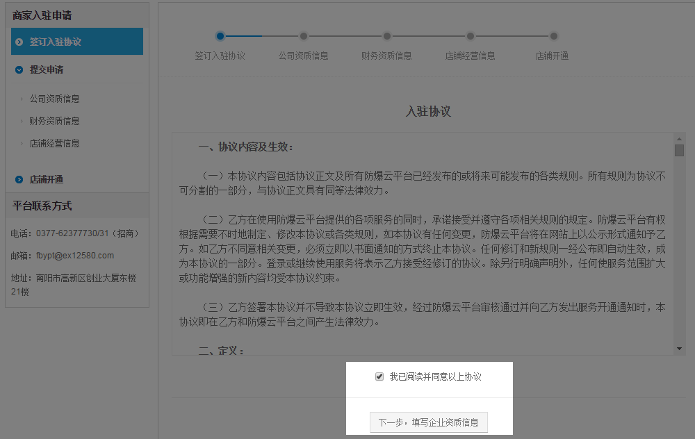 4、簽(qian)署在線協議,勾選“我已閱讀(du)并(bing)同意以上協議(yi)”,并(bing)點擊“下一步,填寫企業資質信息”。
