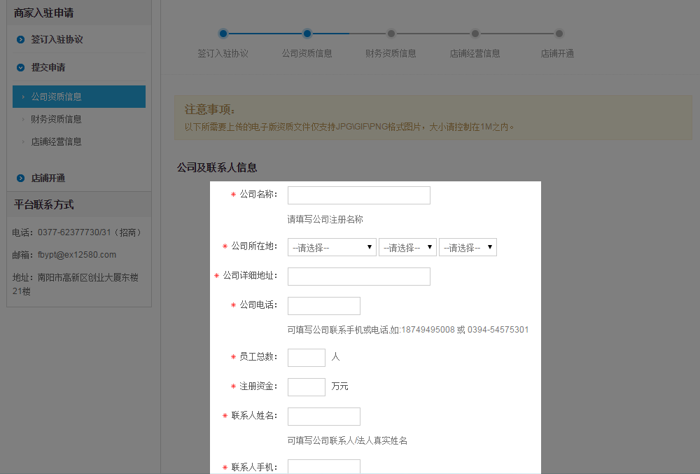 5、進(jin)入商家資質信息提交步驟,填(tian)(tian)寫(xie)(xie)公(gong)司(si)及(ji)聯系人信息(xi)(xi),按提(ti)示填(tian)(tian)寫(xie)(xie)公(gong)司(si)基(ji)本信息(xi)(xi)及(ji)聯系人信息(xi)(xi)。