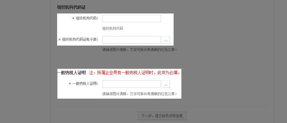 7、填寫公司組織機構代碼證信息,電子版需加蓋企業公章并保證圖片清晰。填寫一般納稅人相關信息,稅務登記證電子版需加蓋企業公章并保證圖片清晰。填寫完成(cheng)后,點擊(ji)“下一步,提(ti)交(jiao)財(cai)務資質信息”。