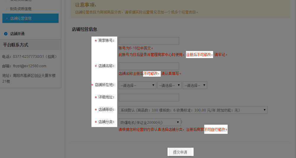 10、進入店鋪經營信息頁面,商家賬號和商鋪名稱等一旦注冊不可修改,請認真填寫。填(tian)寫完成后,點擊“提(ti)交申請”。