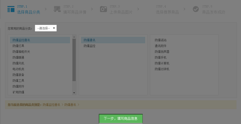 2、選(xuan)擇(ze)商品(pin)(pin)分類,選(xuan)擇(ze)相應的小類別,選(xuan)擇(ze)完畢(bi),點擊下(xia)一(yi)步(bu),填寫(xie)商品(pin)(pin)信息(xi)。