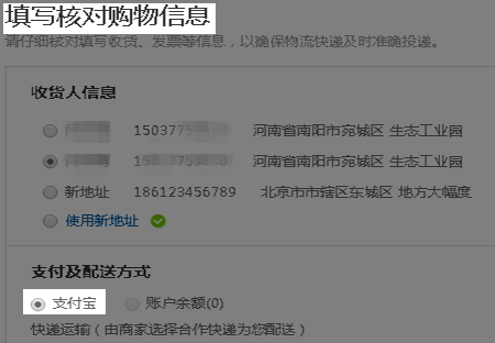 3、填寫地址與收貨人信息,選擇支付及配送方(fang)式,提交訂單。