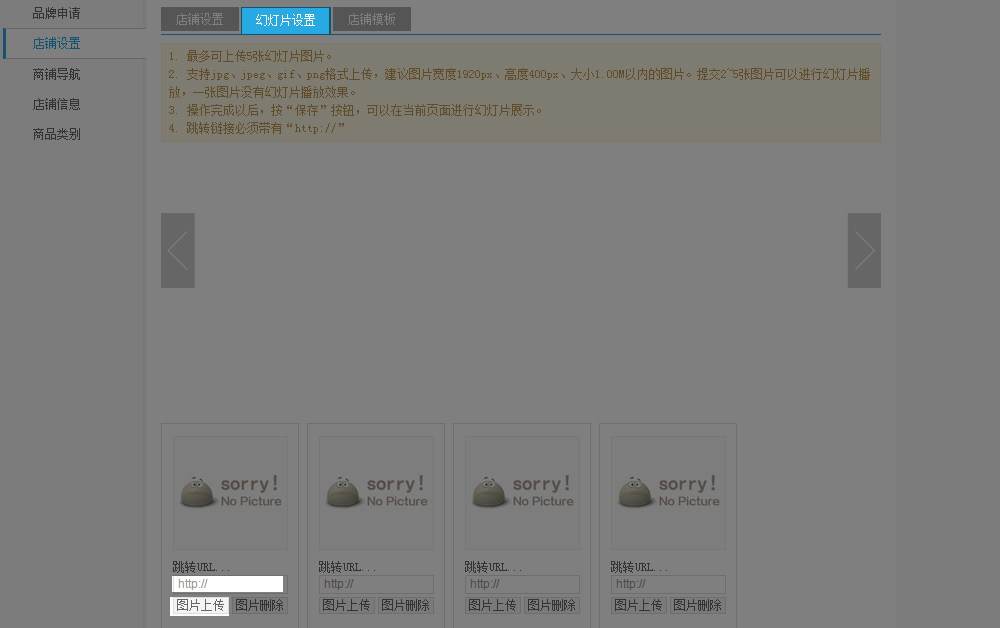5、點擊“幻燈片(pian)設置(zhi)”,在(zai)幻(huan)燈(deng)片(pian)(pian)設置(zhi)頁面(mian)下方上傳(chuan)圖片(pian)(pian),按照頁面(mian)上方關(guan)于上傳(chuan)圖片(pian)(pian)的格式、大小等(deng)要求選擇圖片(pian)(pian),并在(zai)如圖所示位(wei)置(zhi)添加(jia)圖片(pian)(pian)鏈接。然(ran)后提交保存完成店鋪幻(huan)燈(deng)片(pian)(pian)設置(zhi)。