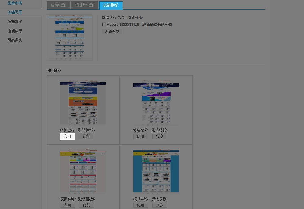 6、點擊“店(dian)鋪模版”,通常不選(xuan)擇的情況下店(dian)鋪應(ying)用的是(shi)默認模版,選(xuan)擇自己(ji)喜歡的模版,預覽(lan)后點擊“應(ying)用”即可(ke)。