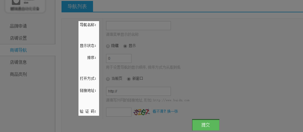 8、填寫導航(hang)(hang)名稱、顯示(shi)狀態、排序及打開方式、選擇鏈接地址后提交保(bao)存完(wan)成店鋪導航(hang)(hang)的(de)添加。