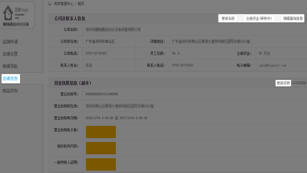 9、打開左側“店鋪信息”,對店鋪注冊基本信息進行查看和修改。在(zai)營業執照信(xin)息一欄,點(dian)擊(ji)“更(geng)新資(zi)質”,對店(dian)鋪資(zi)質基(ji)本(ben)信(xin)息進行(xing)修改。