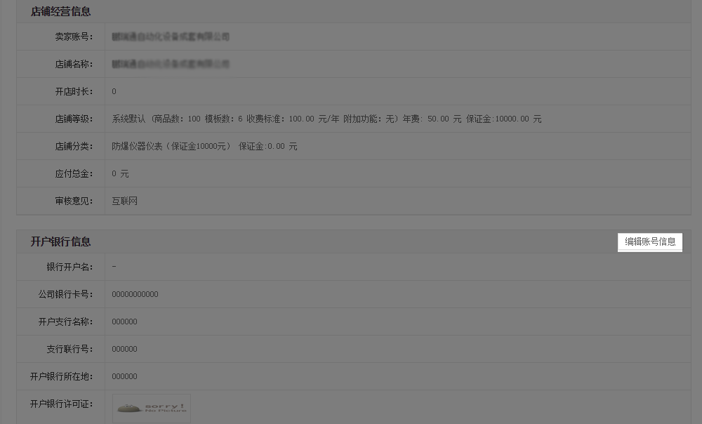 10、 店鋪經營信息為前期注(zhu)冊時的資(zi)料,無法(fa)修改,點擊“編輯帳號信息“可以修改開(kai)戶(hu)銀行信息。