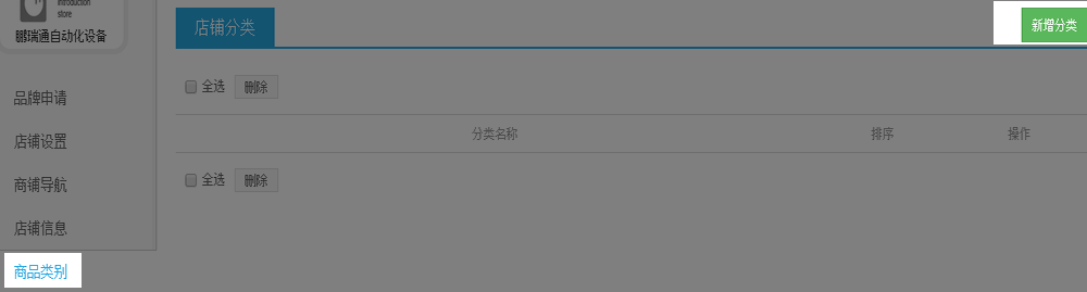 11、打(da)開左側“商品類別”,對店鋪所(suo)售(shou)商品分(fen)類進(jin)行添(tian)加。點(dian)擊“新增(zeng)分(fen)類”添(tian)加分(fen)類。