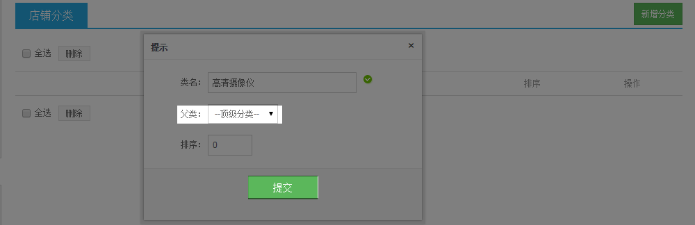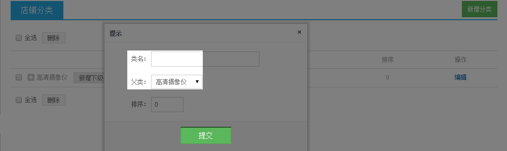 12、填寫類名及(ji)排序后提交,完成商品分類的添加。