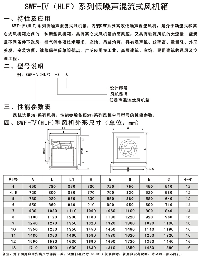 GXF系列斜流通風機按葉輪直徑分為400-1400mm十四規格,按類型分為A、B、C、D、S五種類型,共五十八個機號。風量由3000-90000m3/h,全壓由185-2500Pa;這樣就給設計部門和用戶單位提供了充分的選擇條件,具體數據請查風機性能參數表。
