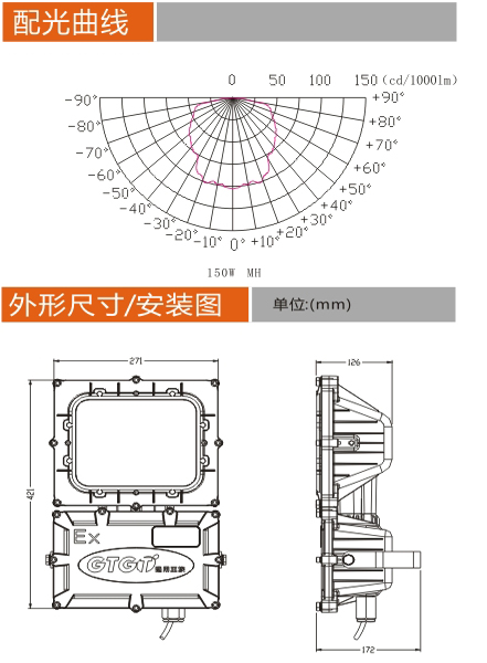 適用于(電力、冶金、鐵路、礦山、港口、市政等行業)廠區、廠房、場站、場館、鐵路隧道、橋涵輸煤棧道、電纜溝、作業平臺等普通及防爆場所作泛光照明使用。