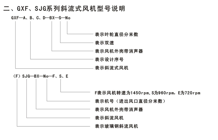 GXF系列斜流通風機按葉輪直徑分為400-1400mm十四規格,按類型分為A、B、C、D、S五種類型,共五十八個機號。風量由3000-90000m3/h,全壓由185-2500Pa;這樣就給設計部門和用戶單位提供了充分的選擇條件,具體數據請查風機性能參數表。